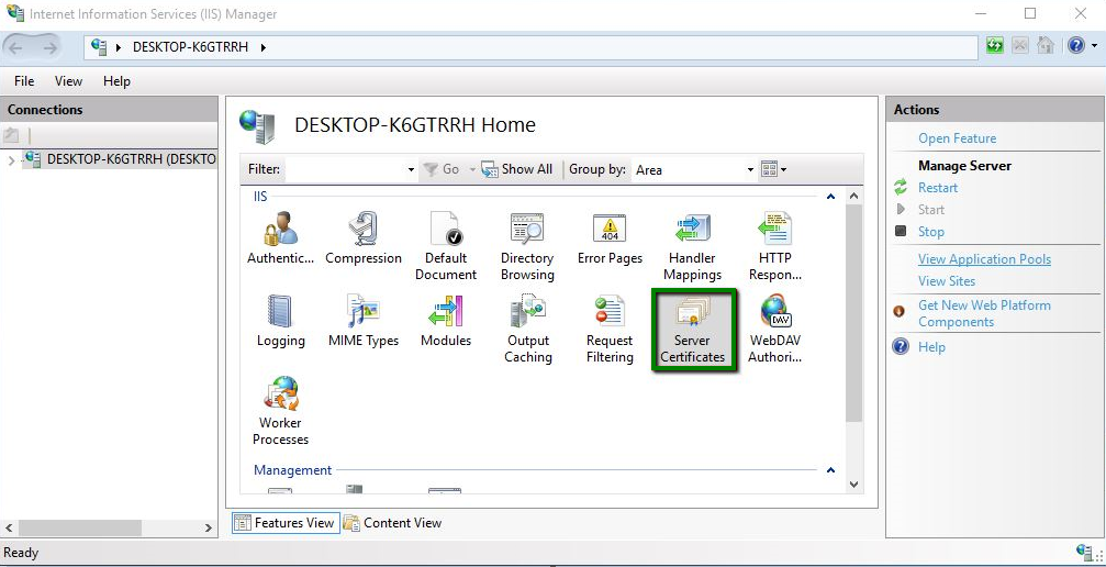 2. Haga doble clic en el icono Certificados de servidor en la página de inicio del Administrador de IIS.