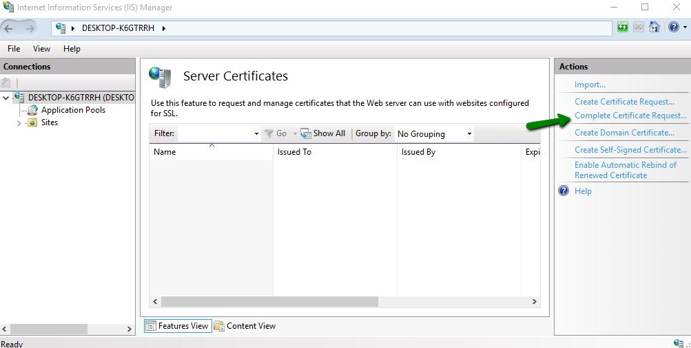 3. Pase el mouse sobre el panel Acciones en el lado derecho de la ventana y haga clic en Completar solicitud de certificado.