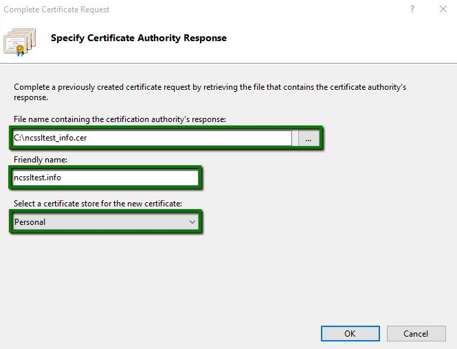 5.Cuando haya completado todos los campos, haga clic en Aceptar para importar el certificado al almacenamiento del servidor.