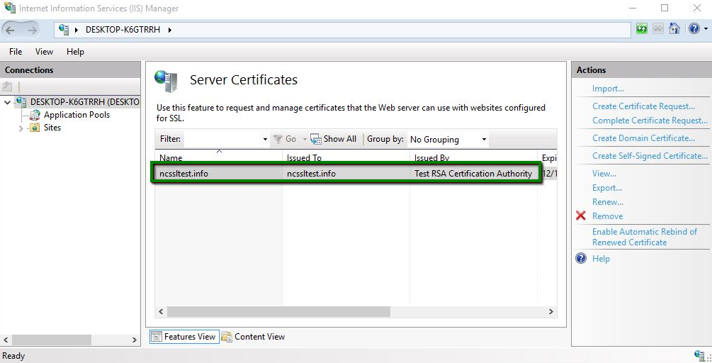 6.Si la instalación se realiza correctamente, aparecerá una nueva entrada en la página Certificados del servidor.