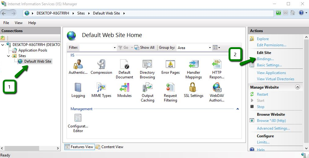 1.El certificado SSL instalado ahora debe asignarse a un sitio web vinculándolo a un puerto seguro. Para hacer esto, seleccione la carpeta Sitios en el panel Conexiones en el lado izquierdo del Administrador de IIS y haga clic en el sitio correspondiente. Luego, en el panel Acciones en el lado derecho, seleccione Bindings….(Enlaces….)