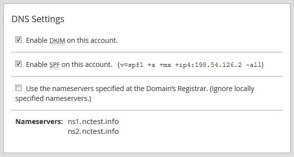 En este cuadro puede habilitar los registros DKIM y SPF utilizados para la autenticación de correo electrónico y definir los servidores de nombres, ya sea los especificados en el lado del registrador de su dominio o los configurados en el menú de configuración Basic cPanel & WHM.