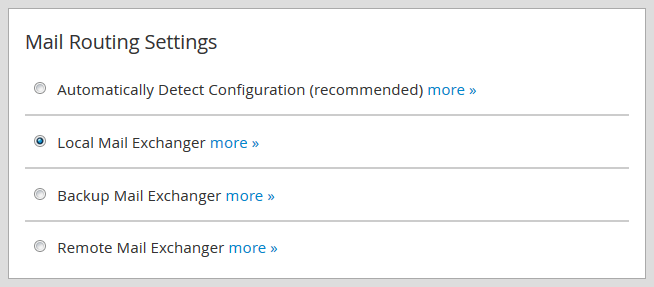 Intercambiador de correo local: esta opción configurará el servidor para que siempre acepte correo localmente siempre que se envíe desde el servidor o fuera del servidor, selecciónelo si desea utilizar su servicio de correo electrónico cPanel